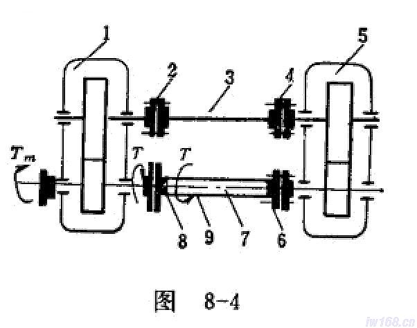 閉式試驗臺,是由兩臺中心距和傳動比相同的齒輪箱(見圖8-4中的1和5),用傳動軸3,彈性軸7和聯(lián)軸節(jié)2、4、6、8相連結(jié),形成一封閉系統(tǒng)。施加載荷時,松開加載聯(lián)軸節(jié)8的聯(lián)接螺釘,施加外力矩,使彈性軸產(chǎn)生扭轉(zhuǎn)變形,然后鎖緊聯(lián)軸節(jié)8上的聯(lián)接螺釘,也就是鎖住了彈性軸7的扭轉(zhuǎn)變形。在這·個封閉系統(tǒng)內(nèi),由彈性軸變形而產(chǎn)生的封閉載荷,它只能使嚙合輪齒之間產(chǎn)生一定的嚙合力而并不帶動它們運轉(zhuǎn)。換句話說,加載機(jī)構(gòu)只是把力施加于系統(tǒng)之內(nèi),但并未對系統(tǒng)做功。當(dāng)試驗臺運轉(zhuǎn)時,電動機(jī)輸出的功率比開式試驗臺小得多,僅需用來克服試驗臺整個系統(tǒng)的內(nèi)摩擦損耗,這些損耗包括嚙合損耗、攪油損耗、軸承損耗、聯(lián)軸節(jié)損耗和彈性軸上的損耗等。不過,后兩項損耗極為微小,可略而不計。閉式試驗臺驅(qū)動電機(jī)的功率,約為封閉系統(tǒng)傳遞功率的4~10%,其數(shù)值與嚙合付的效率、潤滑油粘度和加載器的轉(zhuǎn)動慣量等有關(guān),因此,閉式試驗臺所消耗的功率比開式試驗臺節(jié)約得多。下面分析一下閉式試驗臺系統(tǒng)中功率流動的情況。