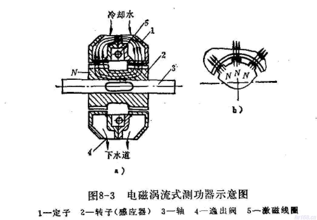 加載器有機(jī)械的(圖8-2)、水力的(水力測功器)、電力的和電磁渦流的(圖8-3),前三種測功器是常見的,此處不再贊述,下面主要介紹電磁渦流式測功器。