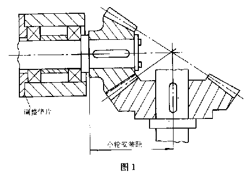 首先,根據(jù)制造者提供的安裝距將小輪定位(圖1)。為此應(yīng)裝上未配磨好的調(diào)整墊片,測量出安裝距,計算出調(diào)整墊片的正確尺寸。測量安裝距也可用專門的量具測量。然后再按標明的側(cè)隙調(diào)整大輪,這一側(cè)隙應(yīng)在嚙合的 緊點測量,可用壓表法測。先把小輪固定,防止轉(zhuǎn)動,牢固裝上百分表,使百分表觸頭垂直于輪齒大端 外接近節(jié)圓直徑的齒面,正反向轉(zhuǎn)動大輪