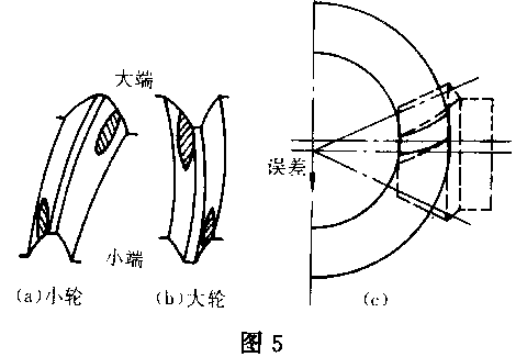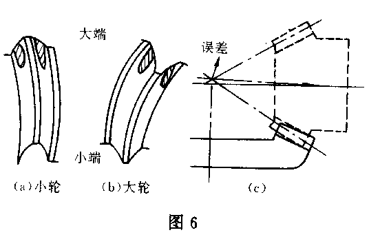 (4)小端或大端接觸區(qū)(圖6) 大小輪輪齒兩側(cè)面的接觸區(qū)都出現(xiàn)在小端或大端,小輪位于正確的安裝距上,齒輪副的側(cè)隙也正確,這是因為兩軸的軸交角太大或太小,圖示僅是左旋小輪且偏搖按圖示方向時的接觸區(qū)。當小輪為右旋及偏搖方向不同時,輪齒的接觸區(qū)又有所不同。
