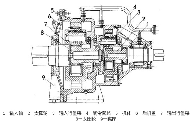2、減速機采用漸開線行星齒輪傳動,合理利用內(nèi)、外嚙合、功率分流,