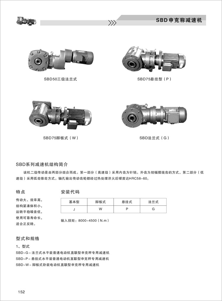 SBD系列申克秤專用減速機是由行星擺線傳動前級減速,弧齒錐齒減速傳動為后級減速,廣泛應(yīng)用于冶金,水泥,鋼鐵,礦山,煤炭,化工行業(yè)的調(diào)速秤上。配套于TDG調(diào)速秤上一般有SBD50型和SBD65型兩種,功率在0.37KW-1.5KW。流量大的稱配SBD75型根據(jù)用戶臺時產(chǎn)量大小,配置相應(yīng)的功率,同時根據(jù)現(xiàn)場工藝空間大小,需注明左裝還是右裝。
