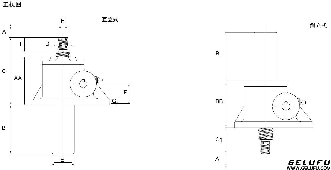 螺紋端和法蘭端的升降機(jī),直立式和倒立式收縮尺寸相同。 螺母運(yùn)動(dòng)式升降機(jī)(參考1.3)的外殼尺寸與絲桿運(yùn)動(dòng)式升降機(jī)相同。 尺寸如有變更,恕不另行通知。