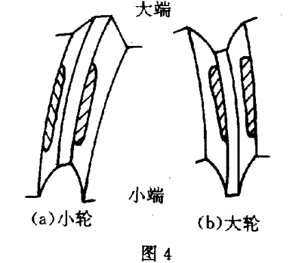 (4)小端或大端接觸區(qū)(圖6) 大小輪輪齒兩側(cè)面的接觸區(qū)都出現(xiàn)在小端或大端,小輪位于正確的安裝距上,齒輪副的側(cè)隙也正確,這是因?yàn)閮奢S的軸交角太大或太小,圖示僅是左旋小輪且偏搖按圖示方向時(shí)的接觸區(qū)。當(dāng)小輪為右旋及偏搖方向不同時(shí),輪齒的接觸區(qū)又有所不同。
