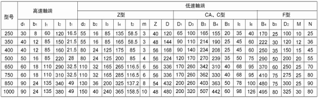 ZQ型減速機(jī)共有九種裝配型式見圖1,輸入軸伸為圓錐形,輸出軸端型式有圓柱型軸伸(z型)、齒輪型軸伸(CA型)以及歐氏(十字滑塊)聯(lián)軸器型軸伸(F型)。