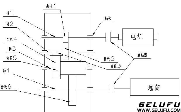 三級(jí)展開(kāi)式圓柱齒輪減速器升降機(jī)的傳動(dòng)示意圖