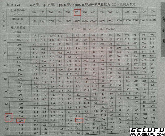 當(dāng)n=970r/min,i=160時(shí),根據(jù)機(jī)械設(shè)計(jì)手冊(cè)對(duì)QJS型、QJRS型、QJS-D型、QJRS-D型承載能力表格,高速軸許用功率為7.6Kw,相對(duì)應(yīng)的減速器為:QJRS-D 335-160 P