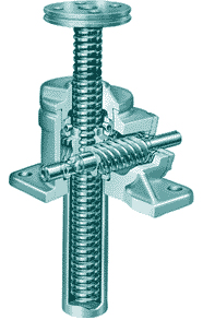 螺旋絲桿升降機(jī)分很多種,下面介紹一種常見(jiàn)的絲桿升降機(jī),它具有體積小、使用方便、安裝靈活等諸多特點(diǎn)。起重能力從2.5噸到120噸,9種標(biāo)準(zhǔn)。蝸輪升降機(jī)絲桿升降機(jī)是由蝸輪減速機(jī)和升降絲桿組成,其減速部件是蝸桿傳動(dòng),利用蝸桿帶動(dòng)蝸輪實(shí)現(xiàn)減速。蝸輪中心是內(nèi)螺紋結(jié)構(gòu),相當(dāng)于升降絲桿的螺母,和升降絲桿相匹配。升降速度等于蝸桿輸入轉(zhuǎn)速除以蝸輪蝸桿的減速比,然后乘以升降絲桿的螺距。由于其結(jié)構(gòu)的原因,這種絲桿升降機(jī)一般采用潤(rùn)滑脂潤(rùn)滑,部分系列有采用潤(rùn)滑油潤(rùn)滑,要比潤(rùn)滑脂潤(rùn)滑的系列更具有壽命長(zhǎng)、工作穩(wěn)定的 點(diǎn)。左圖為升降機(jī)剖視圖: