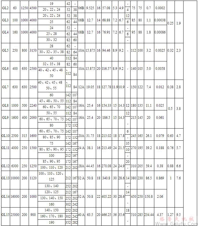 注:1.有罩殼時,在型號后加“F”,例 GL5 型聯(lián)軸器,有罩殼時改為 GL5F。 2.表中聯(lián)軸器質(zhì)量、轉(zhuǎn)動慣量是近似值。
