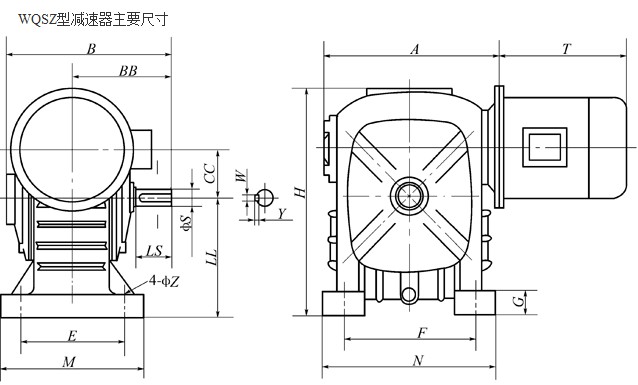 WQSZ50、WQSZ60、WQSZ70、WQSZ80、WQSZ100、WQSZ120、WQSZ135、WQSZ155、型圓柱蝸桿減速機(jī)主要尺寸