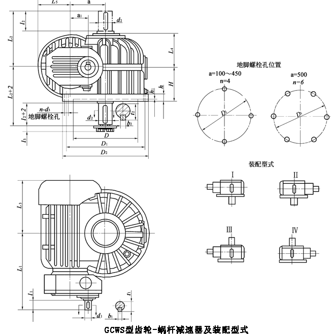 GCWS100、GCWS125、GCWS160、GCWS200、GCWS250、GCWS315、GCWS355、GCWS400、GCWS450、GCWS500、型低速級蝸桿蝸輪之側(cè)的齒輪-蝸桿減速機的裝配形式與主要尺寸(JB/T7008-1993)