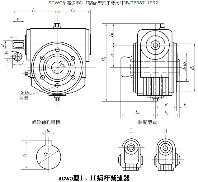 SCWO63、SCWO80、SCWO100、型減速機(jī)I、II裝配型式主要尺寸JB/T6387-1992