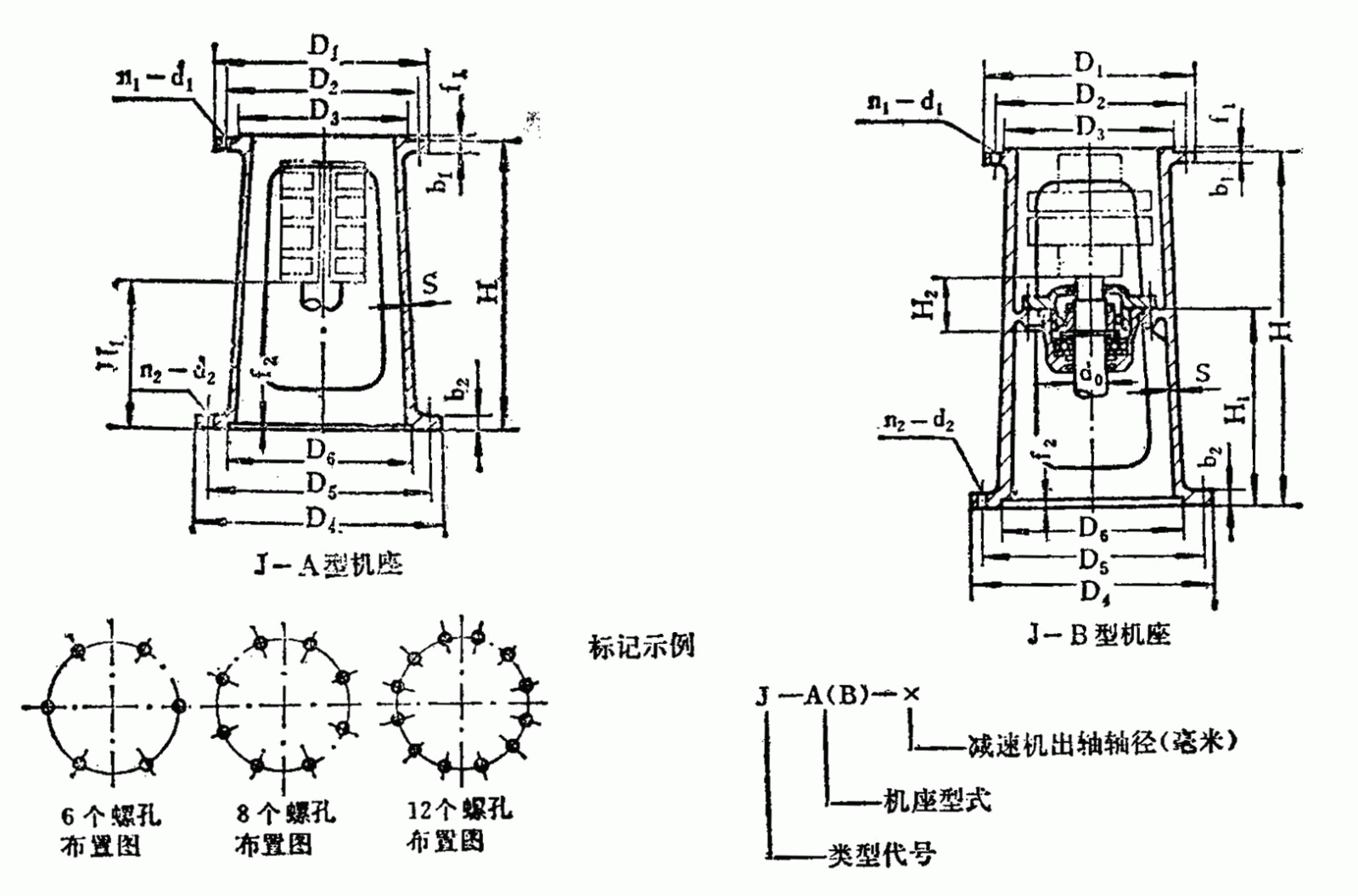 例2:機(jī)座J-B-50 HG5-743-78-附2BⅢ,表示減速機(jī)出軸軸徑為50毫米的帶中間支承的B型機(jī)型。