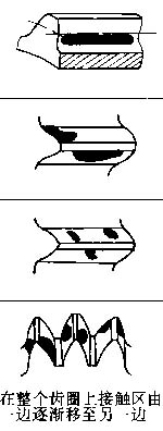 單向角接觸,兩齒輪軸線不平行 | 在中心距公差范圍內(nèi),刮削軸瓦或調(diào)整軸承座 | 一面接觸正常,一面接觸不好。兩面齒向不統(tǒng)一 | |||