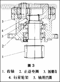 為了防止回轉(zhuǎn)減速機輸出齒軸的脫落,我公司對回轉(zhuǎn)減速機輸出齒軸的防松裝置進行了改進,改進后的裝置如圖3所示,即在輸出齒軸花鍵的下部加工出一段螺紋,裝配時再加上圓螺母3和止退墊圈2,用圓螺母來調(diào)整兩個單列圓錐滾子軸承的軸向間隙。經(jīng)過以上的改進,與圖1、2中采用的回轉(zhuǎn)減速機結(jié)構(gòu)相比,具有以下 點: