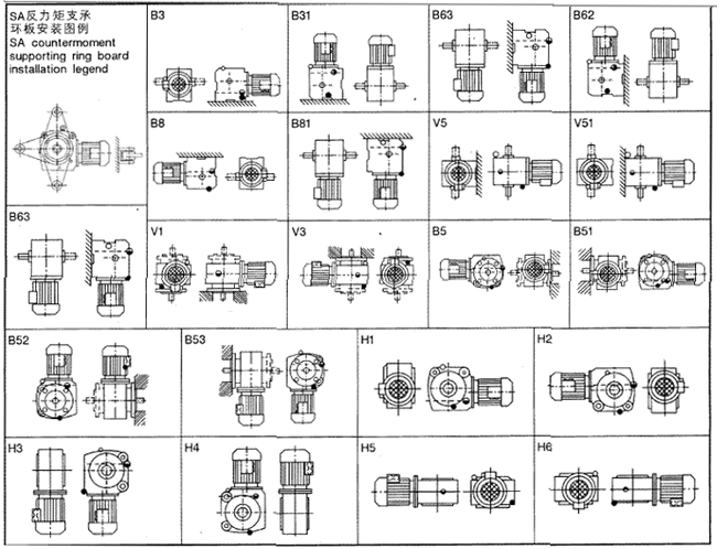 S32減速機(jī)、S42減速機(jī)、S52減速機(jī)、S62減速機(jī)、S72減速機(jī)、S82減速機(jī)、S92系列斜齒輪蝸桿減速機(jī)外形及安裝方位外形及安裝尺寸