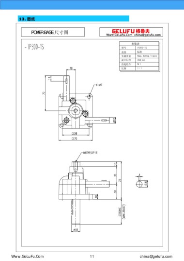 13. 圖紙 POWER BASE 尺寸圖 參數(shù)表 型號 IP300-1S 類型 標(biāo)準(zhǔn) 負(fù)載重量 Max. 300Kg / 4 pcs 最大行程 350 mm 齒輪組件 M 1 比例 1 : 1 m.xuexigo.cn 11 china@gelufu.com