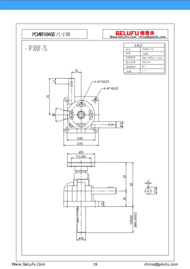POWER BASE 尺寸圖 參數(shù)表 型號(hào) IP300F-1S 類型 標(biāo)準(zhǔn) 負(fù)載重量 Max. 300Kg / 4 pcs 最大行程 350 mm 齒輪組件 M 1 比例 1 : 1 m.xuexigo.cn 19 china@gelufu.com