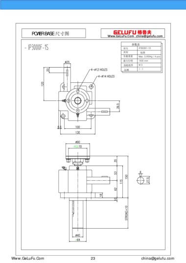 POWER BASE 尺寸圖 參數(shù)表 型號(hào) IP3000F-1S 類型 標(biāo)準(zhǔn) 負(fù)載重量 Max. 3,000Kg / 4 pcs 最大行程 1500 mm 齒輪組件 M 3 比例 1 : 1 m.xuexigo.cn 23 china@gelufu.com