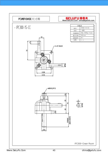 POWER BASE 尺寸圖 參數(shù)表 型號 IP300-1S-CC 類型 標準 負載重量 Max. 300Kg / 4 pcs 最大行程 350 mm 齒輪組件 M 1 比例 1 : 1 IPC300-Crean Room m.xuexigo.cn 43 china@gelufu.com