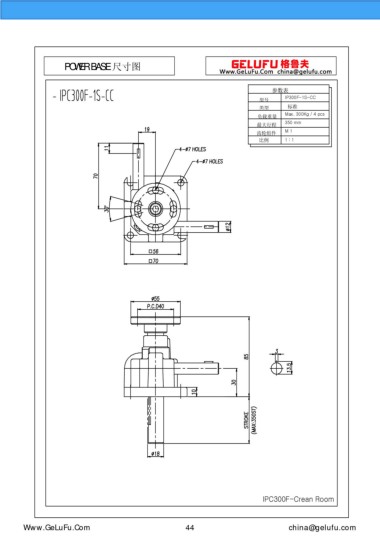 POWER BASE 尺寸圖 參數(shù)表 IP300F-1S-CC 型號 類型 標準 Max. 300Kg / 4 pcs 負載重量 350 mm 最大行程 齒輪組件 M 1 比例 1 : 1 IPC300F-Crean Room m.xuexigo.cn 44 china@gelufu.com