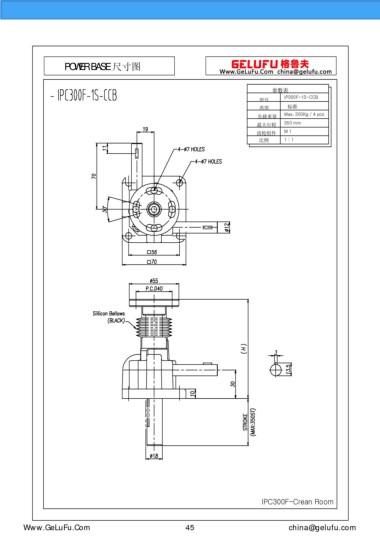 POWER BASE 尺寸圖 參數(shù)表 IP300F-1S-CCB 型號(hào) 類型 標(biāo)準(zhǔn) Max. 300Kg / 4 pcs 負(fù)載重量 最大行程 350 mm 齒輪組件 M 1 比例 1 : 1 IPC300F-Crean Room m.xuexigo.cn 45 china@gelufu.com