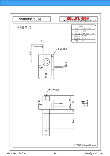POWER BASE 尺寸圖 參數(shù)表 IPC500-1S-CC 型號 類型 標準 負載重量 Max. 500Kg / 4 pcs 最大行程 600 mm 齒輪組件 M 1.5 比例 1 : 1 IPC500-Crean Room m.xuexigo.cn 47 china@gelufu.com