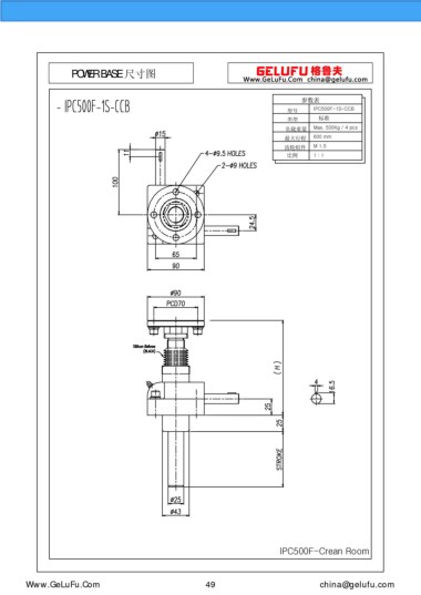 POWER BASE 尺寸圖 參數(shù)表 型號(hào) IPC500F-1S-CCB 類型 標(biāo)準(zhǔn) 負(fù)載重量 Max. 500Kg / 4 pcs 最大行程 600 mm 齒輪組件 M 1.5 比例 1 : 1 IPC500F-Crean Room m.xuexigo.cn 49 china@gelufu.com