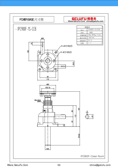 POWER BASE 尺寸圖 參數(shù)表 IPC900F-1S-CCB 型號 類型 標準 負載重量 Max. 900Kg / 4 pcs 最大行程 1300 mm 齒輪組件 M 1.5 比例 1 : 1 IPC900F-Crean Room m.xuexigo.cn 53 china@gelufu.com