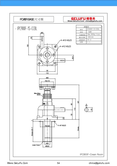 POWER BASE 尺寸圖 參數(shù)表 IPC900F-1S-CCBL 型號(hào) 類型 標(biāo)準(zhǔn) 負(fù)載重量 Max. 900Kg / 4 pcs 最大行程 1300 mm 齒輪組件 M 1.5 1 比例 : 1 IPC900F-Crean Room m.xuexigo.cn 54 china@gelufu.com