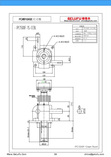POWER BASE 尺寸圖 參數(shù)表 IPC1500F-1S-CCBL 型號 類型 標(biāo)準(zhǔn) 負(fù)載重量 Max. 1,500Kg / 4 pcs 最大行程 1300 mm 齒輪組件 M 1.5 比例 1 : 1 IPC1500F-Crean Room m.xuexigo.cn 58 china@gelufu.com