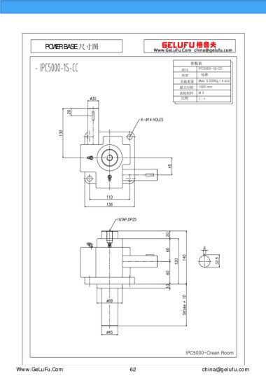 POWER BASE 尺寸圖 參數(shù)表 型號(hào) IPC5000-1S-CC 類型 標(biāo)準(zhǔn) 負(fù)載重量 Max. 5,000Kg / 4 pcs 最大行程 1500 mm 齒輪組件 M 3 比例 1 : 1 IPC5000-Crean Room m.xuexigo.cn 62 china@gelufu.com